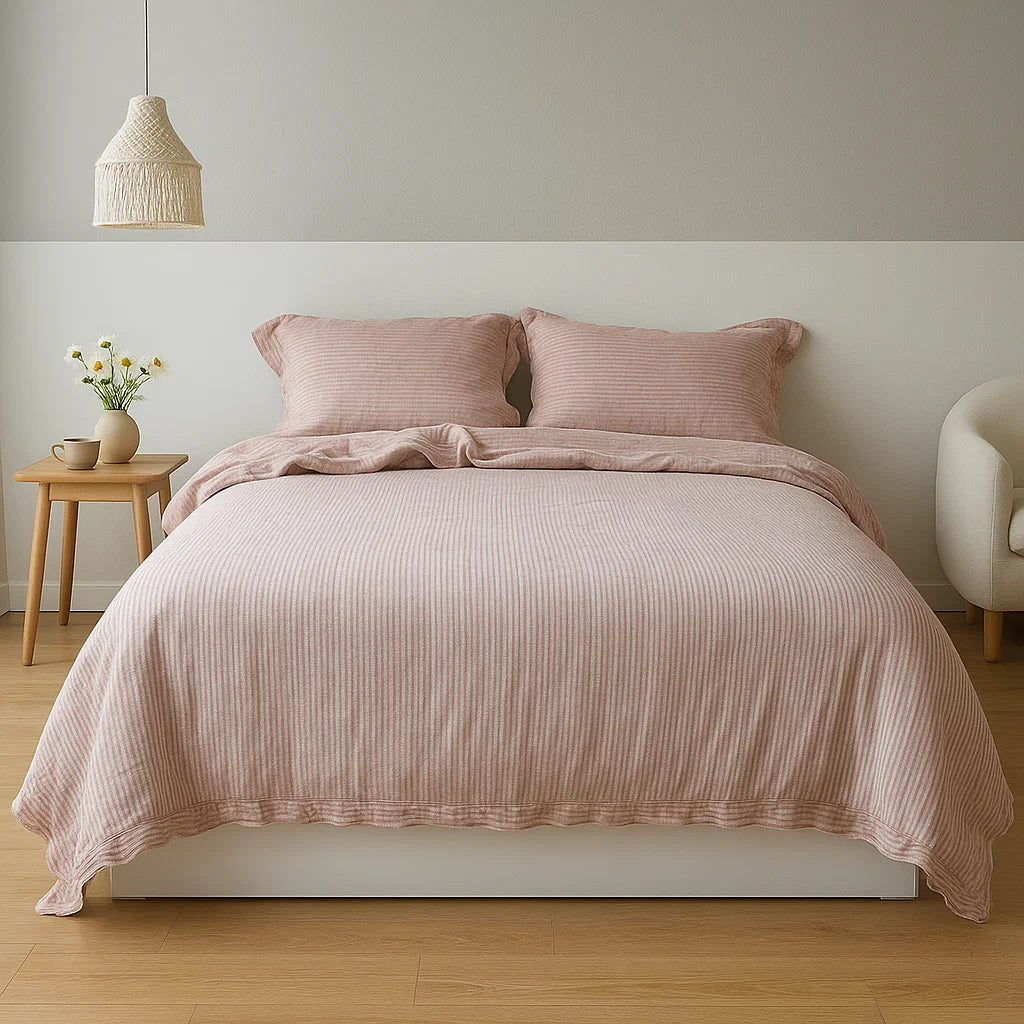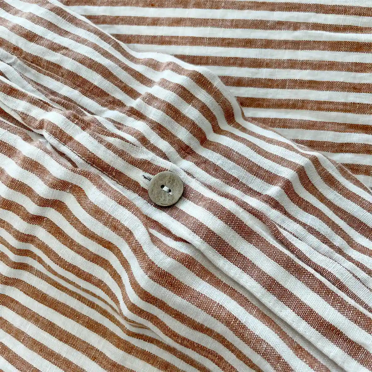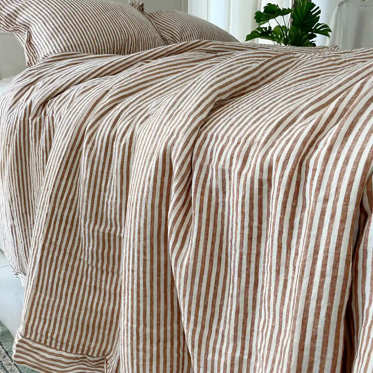 - Klassisches Streifenmuster trifft auf Leinenstoff – ein zeitloses, atmungsaktives Bettwäsche-Must-have.