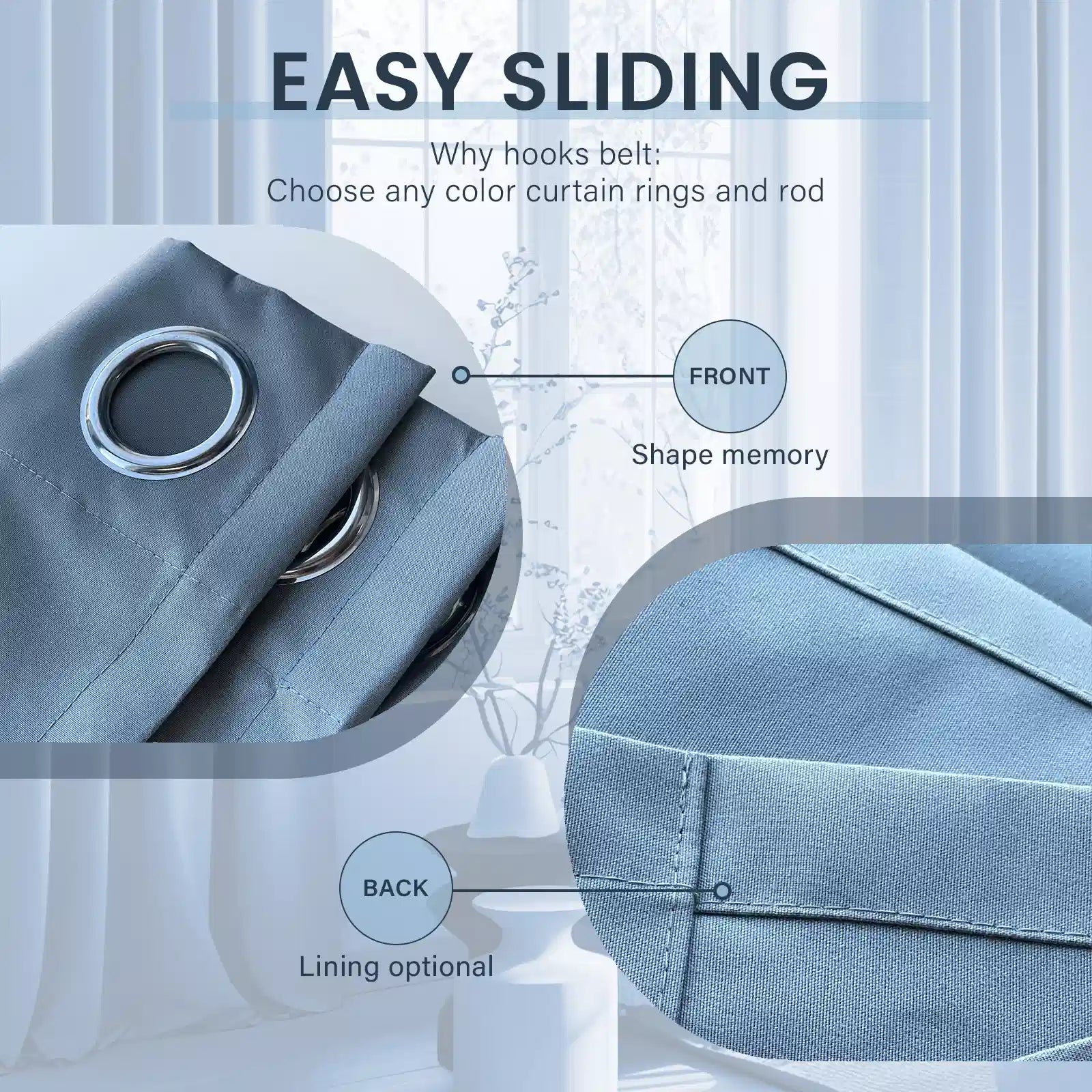 Highlights der Montage dank vernickelter Ösen : Diese Vorhänge sind mit hochwertigen, vernickelten Ösen (Innendurchmesser: ca. 4 cm) ausgestattet, die mit den meisten handelsüblichen Gardinenstangen (bis zu 3 cm Durchmesser) kompatibel sind. Die glatten Kanten der Ösen sorgen für ein müheloses Öffnen und Schließen der Vorhänge und reduzieren so den Verschleiß bei langfristiger Nutzung. Die Montage dauert nur 5–10 Minuten: Fädeln Sie einfach die Gardinenstange durch die Ösen, befestigen Sie die Stange am Fensterrahmen oder an der Wand und richten Sie die Vorhänge aus. Sie benötigen weder kompliziertes Werkzeug noch Fachkenntnisse – ideal für die Selbstmontage.