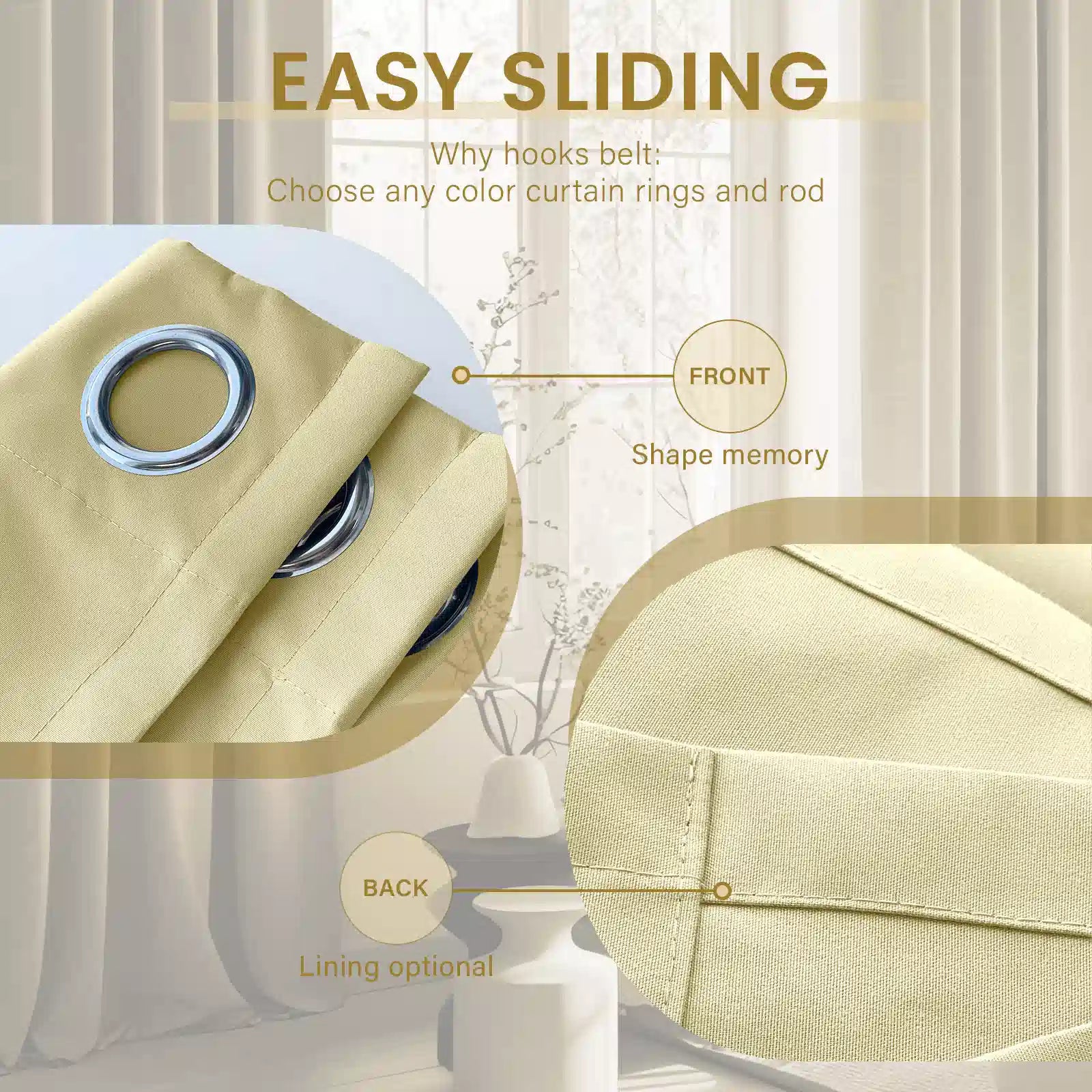 Highlights der Montage dank vernickelter Ösen : Diese Vorhänge sind mit hochwertigen, vernickelten Ösen (Innendurchmesser: ca. 4 cm) ausgestattet, die mit den meisten handelsüblichen Gardinenstangen (bis zu 3 cm Durchmesser) kompatibel sind. Die glatten Kanten der Ösen sorgen für ein müheloses Öffnen und Schließen der Vorhänge und reduzieren so den Verschleiß bei langfristiger Nutzung. Die Montage dauert nur 5–10 Minuten: Fädeln Sie einfach die Gardinenstange durch die Ösen, befestigen Sie die Stange am Fensterrahmen oder an der Wand und richten Sie die Vorhänge aus. Sie benötigen weder kompliziertes Werkzeug noch Fachkenntnisse – ideal für die Selbstmontage.