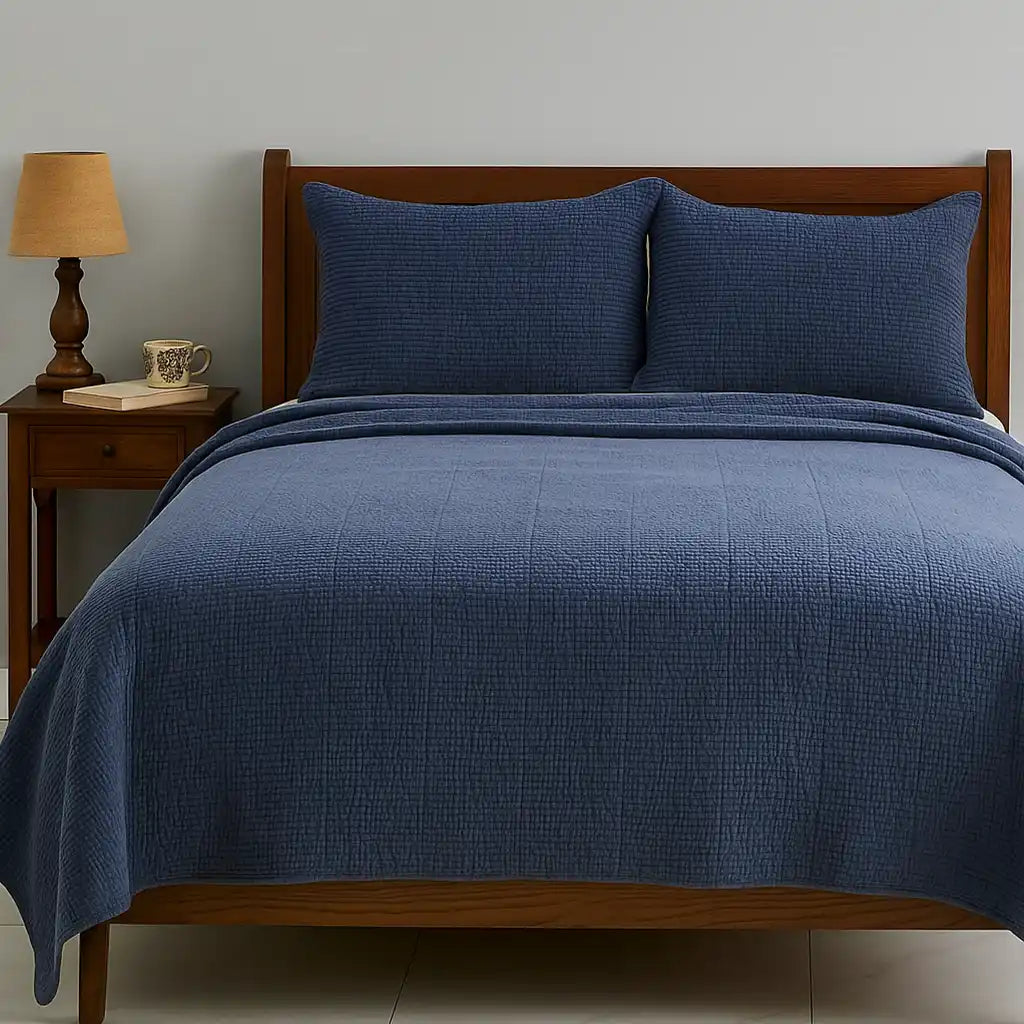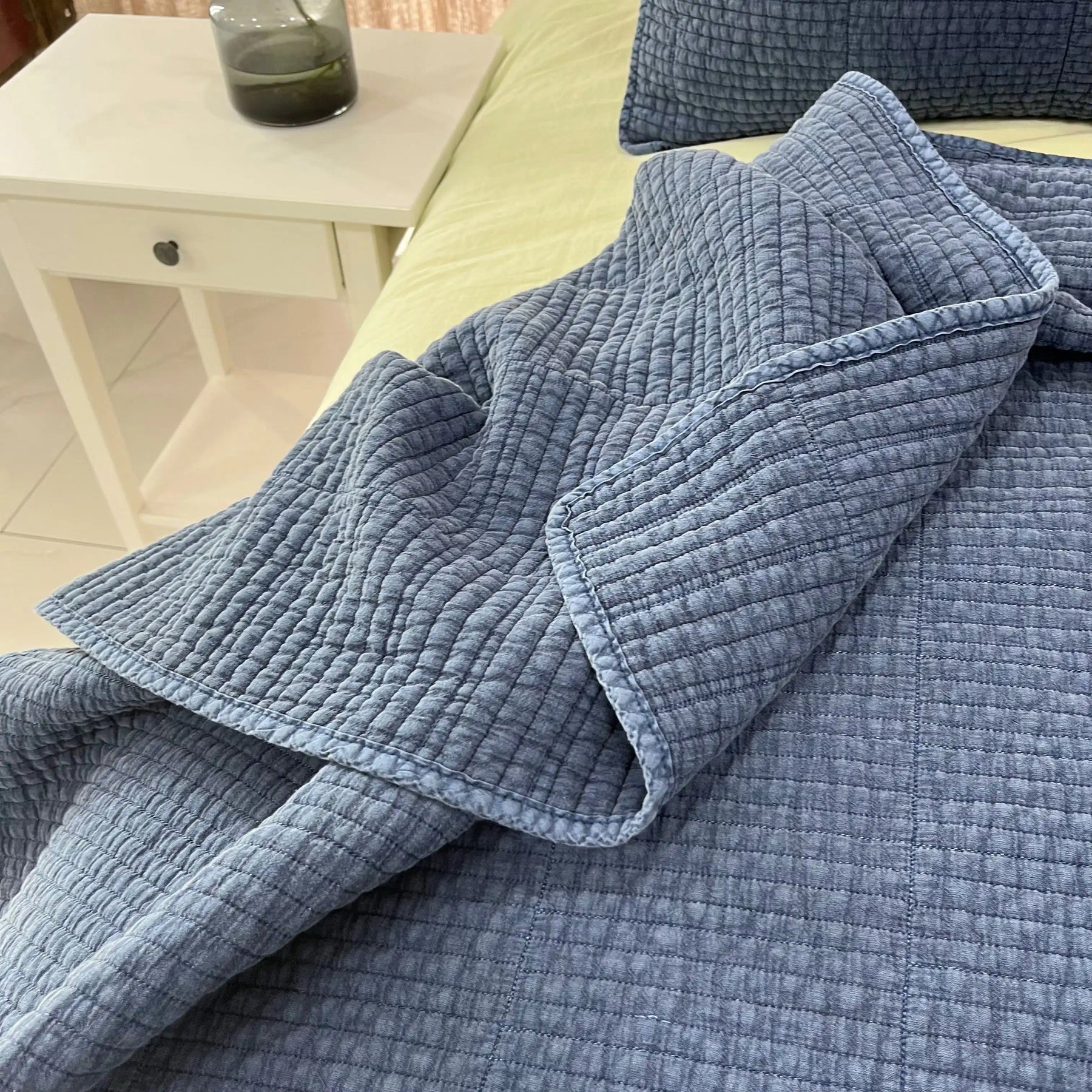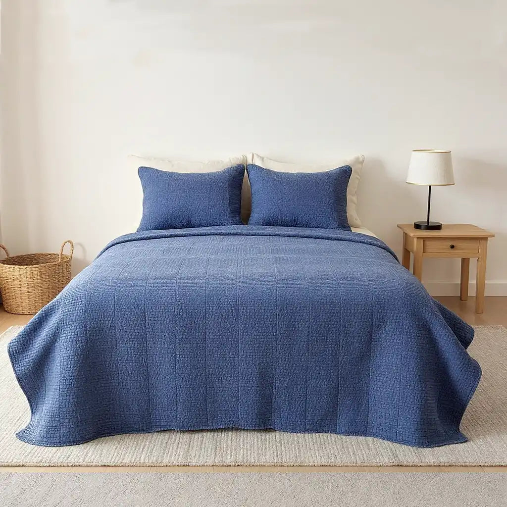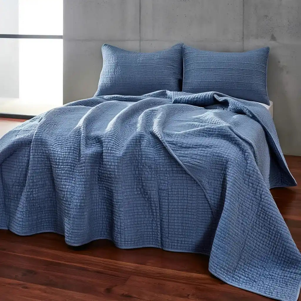 - Die weiche, gesteppte Textur trifft auf ein beruhigendes Mineralblau und steigert so den Liegekomfort und die optische Harmonie der Bettwäsche.